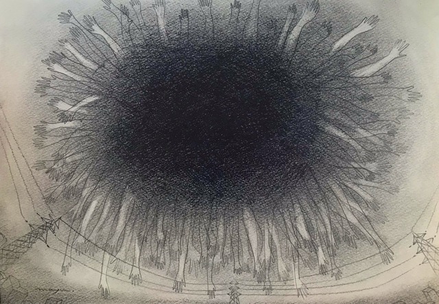 鉛筆と、アクリルのミクストメディアの作品です。仏教の「空」をイメージしています。 未額装ですが、額装をしてお送りします。額装込のお値段です。