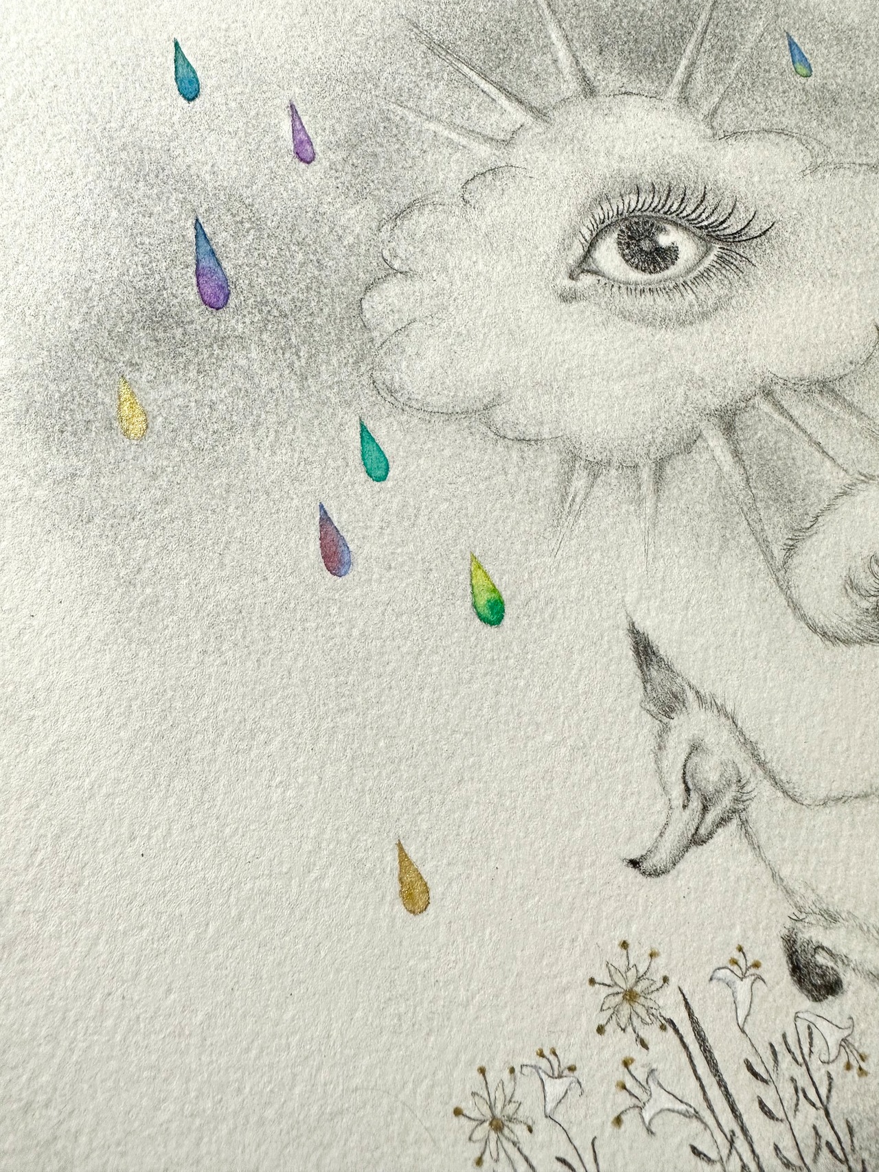 アルシュ紙に鉛筆、アクリルガッシュ、透明水彩で描いてあります。A4サイズくらいの絵です。
